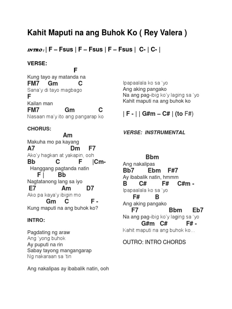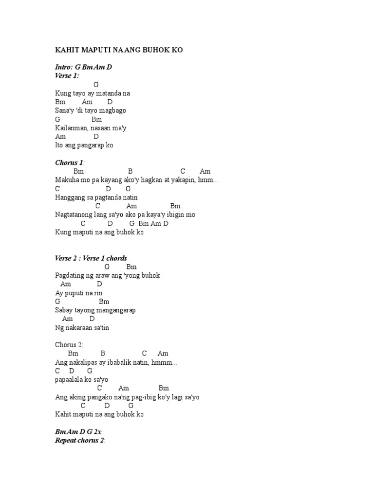 KAHIT MAPUTI NA ANG BUHOK KO. C Hanggang D pagtanda G natin Nagtatanong l C ang sayo ak Am o pa kayay ib Bm igin mo Kung maput C i na a D ng buhok k G o Bm Am D Verse 2 Verse 1 chords Pagdating ng G araw ang Bm yong buhok Ay Am puputi na D rin G Sabay tayong Bm mangangarap Ng n Am akaraan sa D tin. Nasaan may ito ang pangarap ko.